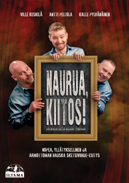 Uusi esitys, Naurua, kiitos!, on nimensä mukaisesti suora vastaus yleisön toiveisiin. Se ei sitoudu yhteen teemaan, vaan koostuu irtonaisista, huippuunsa viritetyistä sketsipätkistä, joissa mikään inhimillinen ei ole vierasta. Esitys on vauhdikas leikkaus suomalaiseen mielenmaisemaan, nykypäivän ilmiöihin ja niihin absurdeihin tilanteisiin, joihin meistä jokainen voi joutua. Kuten aiemmatkin menestystuotannot, myös uusi esitys on suunniteltu tarjoamaan katsojilleen täydellisen irtioton arjesta.